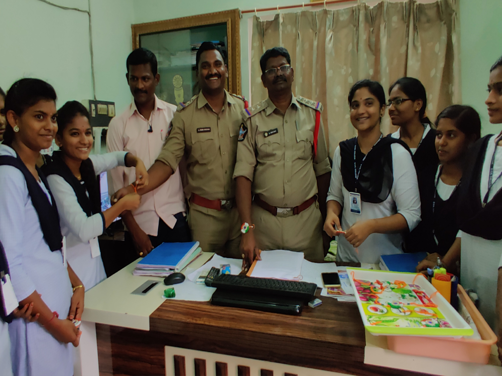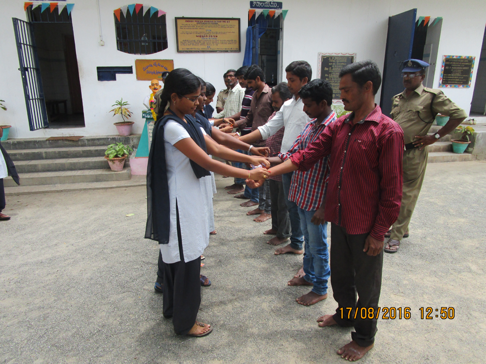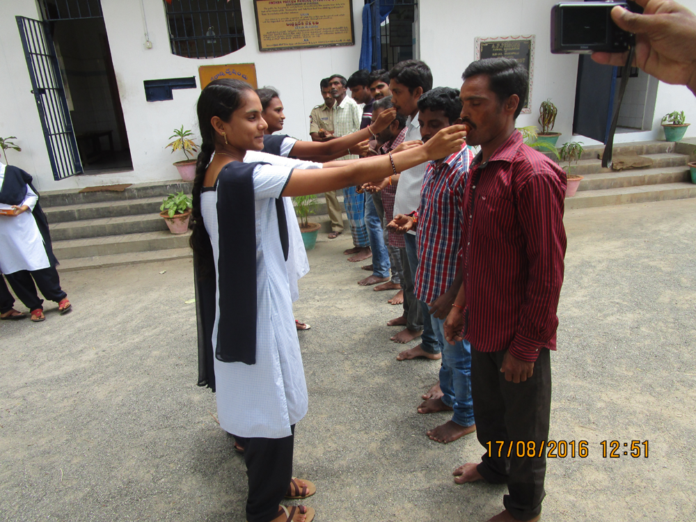 \'Raksha Bandhan\' or \'Rakhi\' is a special occasion to celebrate the virtuous bond of love between a brother and a sister which is one of the deepest and noblest of all human emotions. To commemorate this festival, a Rakhi Making Activity was organized by the Dadi Veerunaidu Cultural Committee Students made beautiful Rakhis using different articles like silken thread, ribbon, etc. Their artisanship was quite fascinating and students thoroughly enjoyed this activity that tickled their creative side. After that, the girl students of our college tied rakhi on the wrists of police officers, Sub jail, Anakapalle.