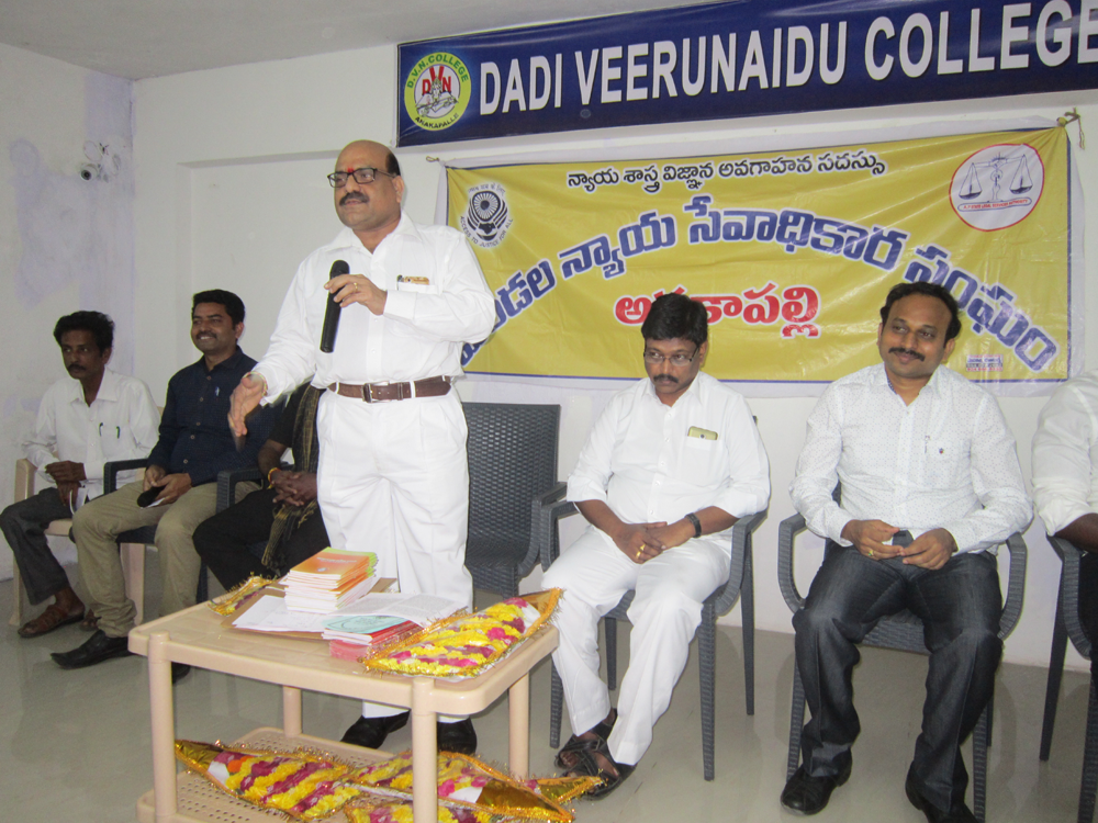 Legal Awareness Programme (LAP) organized by Dadi Veerunaidu College in association with Visakha District Legal Awareness Committee. Chief Guests: Sri. B.B. Nagendra Rao 10th Additional District & Session Judge, Sri. J.V.V.Satyanarayana 2nd Additional Junior Civil Judge, Sri. K. Chandra Sekhar Lok Adalat member Sri.T.V.N. Setty Lok Adalat Member, Sri. M.Srinivasa Rao S.I, Akp Town Police Station, Sri. Dadi Ratnakar,Chairman.